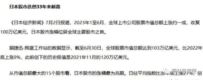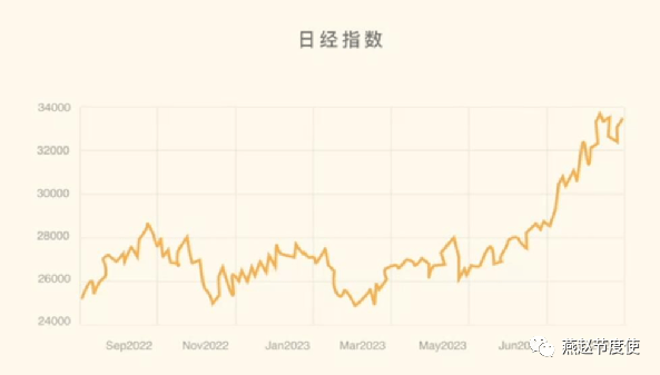 日经的最低点曾是23500点,6月16日日经225指数收于33706.08点,涨幅超过40%,创下33年来的新高,日本股市市值是GDP的120%。。上一回日经指数达到这一水平还是在1989年,那是日本经济最繁荣的年份之一。