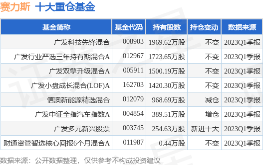 根据2023Q1季报公募基金重仓股数据,重仓该股的公募基金共8家,其中持有数量最多的公募基金为广发科技先锋混合。广发科技先锋混合目前规模为123.36亿元,最新净值0.9047(7月10日),较上一交易日上涨2.11%,近一年下跌33.4%。该公募基金现任基金经理为刘格菘。刘格菘在任的基金产品包括:广发小盘成长混合(LOF)A,管理时间为2017年6月19日至今,期间收益率为84.17%;广发创新升级混合,管理时间为2017年7月5日至今,期间收益率为106.57%;广发双擎升级混合A,管理时间为2018年11月2日至今,期间收益率为126.15%;广发多元新兴股票,管理时间为2018年11月5日至今,期间收益率为102.67%。