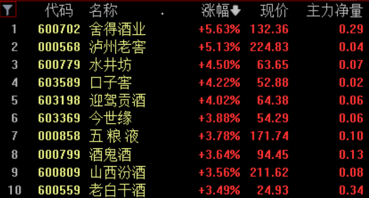 其他消费股也纷纷走强,白酒股领涨,舍得酒业、泸州老窖涨超5%,五粮液、老白干酒、酒鬼酒、山西汾酒等涨超3%。