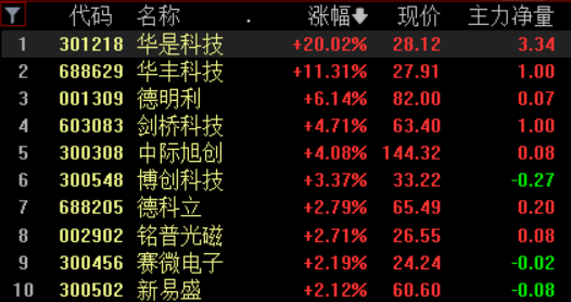 CPO概念股震荡走高,华是科技直线涨停,华丰科技涨超11%,剑桥科技、中际旭创、德明利涨幅居前。