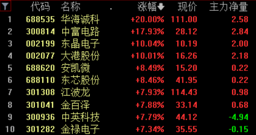 半导体板块持续拉升,华海诚科20cm涨停,股价创上市以来新高,大港股份、德明利涨停,睿能科技、盈方微、晓程科技、东芯股份、江波龙、普冉股份等多股涨超5%。