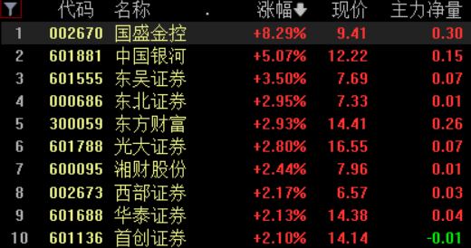 券商股异动拉升,国盛金控涨超8%,中国银河、东方财富、东北证券、光大证券、湘财股份、东吴证券等跟涨。