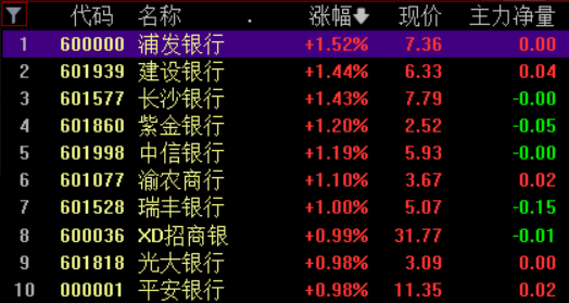 银行、券商等大金融板块集体走高,浦发银行、建设银行、长沙银行、紫金银行等纷纷跟涨。