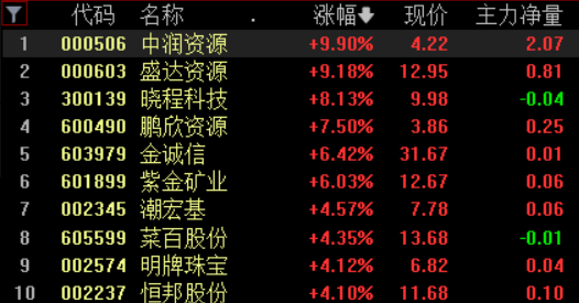 黄金板块早盘大涨,中润资源逼近涨停,四川黄金、紫金矿业、恒邦股份、山东黄金、中金黄金跟涨。
