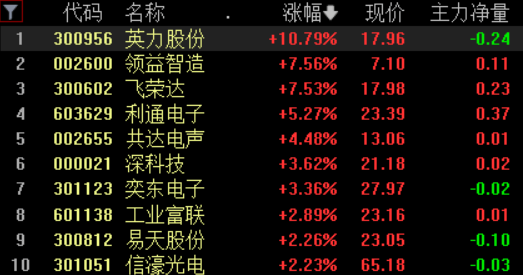 消费电子板块震荡走强,商络电子20cm涨停,英力股份涨超10%,领益智造、飞荣达、共达电声等跟涨。