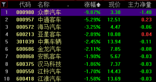 汽车产业链开盘调整,众泰汽车触及跌停,浙江世宝跌超9%,星源卓镁、博俊科技、中马传动、中通客车、海马汽车等跌幅居前。