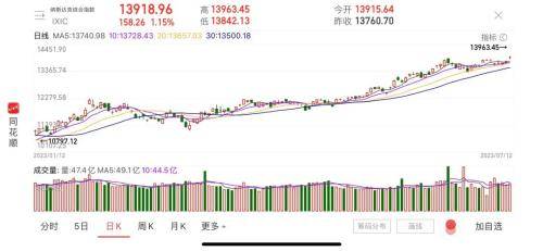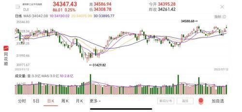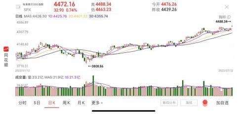 随着通胀数据跌至新低以及加息预期降温,美股三大指数集体收涨,纳斯达克指数收涨158.26点,涨幅1.15%,报13918.96点,逼近14000点和2022年4月5日收盘位14204.17点;标普500指数收涨32.90点,涨幅0.74%,连续第三个交易日上涨,报4472.16点,创2022年4月8日以来收盘新高;道琼斯指数收涨86.01点,涨幅0.25%,报34347.43点。