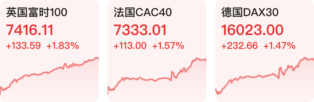 欧洲三大指数全线上涨。截至收盘,英国富时100指数涨1.83%,法国CAC40指数涨1.57%,德国DAX30指数涨1.47%。