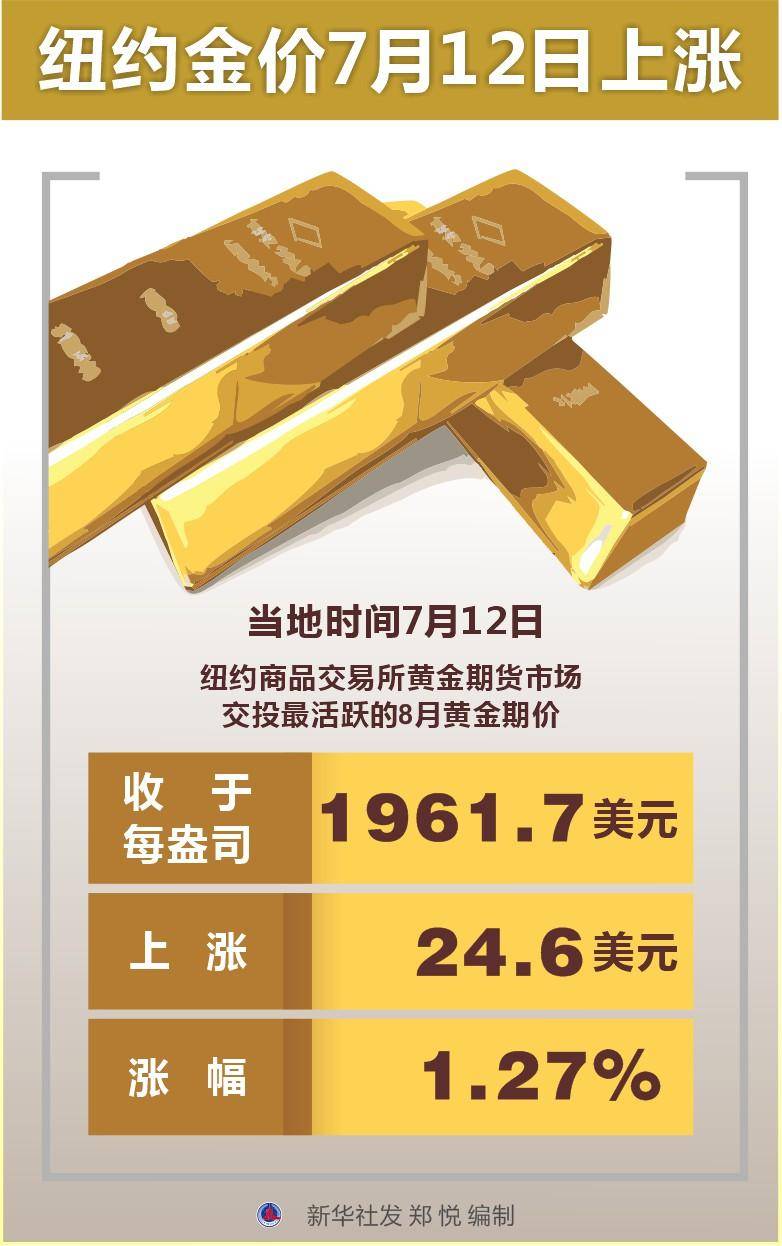 纽约商品交易所黄金期货市场交投最活跃的8月黄金期价当地时间7月12日比前一交易日上涨24.6美元,收于每盎司1961.7美元,涨幅为1.27%。
