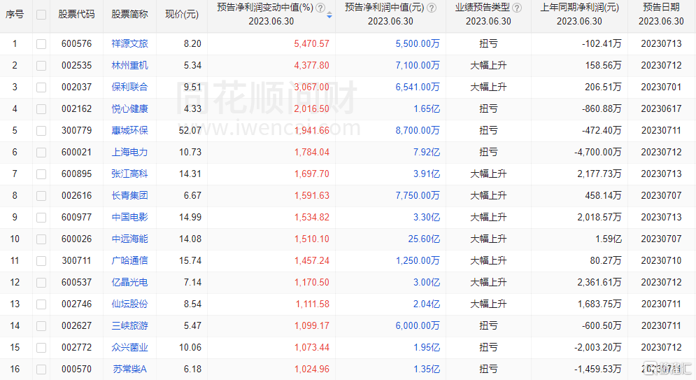 具体到个股看,祥源文旅、林州重机、保利联合等16只个股净利润同比增幅超过10倍。祥源文旅预计净利润增幅最高。公司预计上半年实现净利润中值为5500万元,同比增长5470.57%;林州重机、保利联合预计上半年净利润同比增幅中值分别为4377.8%、3067%,增幅位列第二、第三。