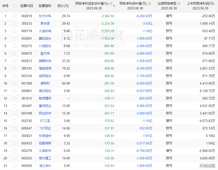 具体到个股看,东方中科、易华录、大连热电、翼凯股份4只个股净利润同比降幅超过10倍。东方中科预计净利润降幅最高。公司预计上半年实现净利润中值为-6250万元,同比降2362.5%;易华录、大连热电预计上半年净利润同比降幅中值分别为2234.39%、2201.28%,降幅位列第二、第三。