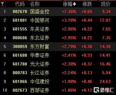 受业绩催化今日证券板块盘表现活跃,截止发稿国盛金控涨超7%,中国银河涨超3%,东方财富、东吴证券、光大证券等拉升。