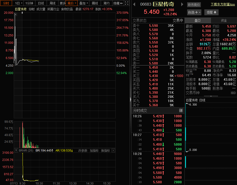 经历了此前的三次闯关失败之后,7月13日,“周杰伦概念股”巨星传奇终于在港交所成功上市。上市首日巨星传奇开盘大涨35.29%,盘中最高涨幅达48.24%,早盘盘中,最高价一度触摸至6.300港元,不过随后涨幅有所回落。截至记者发稿时,巨星传奇涨29.41%,报5.500港元,市值44.00亿港元。