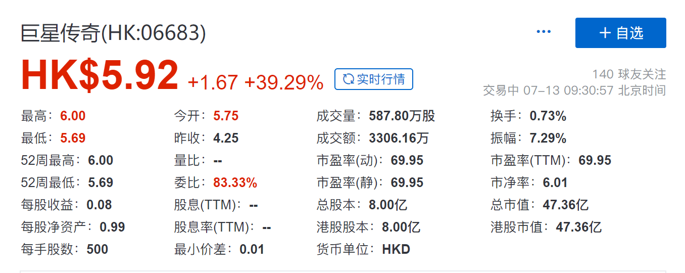 截至9:30,巨星传奇涨39.29%,报5.92港元 ,总市值约47.36亿港元。