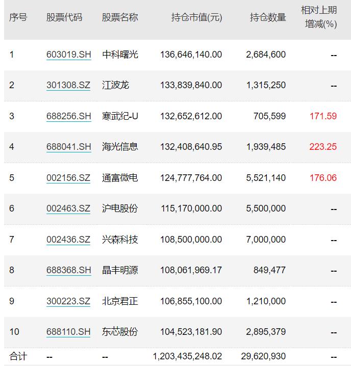 除了规模上的变动,记者注意到,该基金在二季度的持仓变化也非常大,相比于一季度末的持仓,前十大重仓股更换了7只,仅保留了寒武纪-U、海光信息和通富微电,且对这3只个股的持股数也有明显增加。