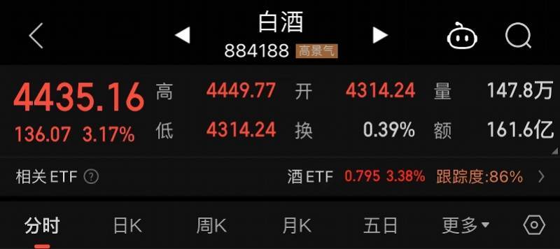 经历连日走势低迷后,白酒板块终于出现了拉升。7月13日早盘收盘,南都湾财社-酒水新消费指数课题组记者注意到,白酒概念出现拉升,同花顺白酒指数早盘收盘报4435.16点涨3.17%。其中多只白酒股股价上扬,泸州老窖、迎驾贡酒、舍得酒业及今世缘涨幅超5%,ST皇台及岩石股份逆势下跌。据了解,白酒股出现异动或与资金对行业下半年预期相关。安信证券研报认为,今年行业的主要矛盾是“强供给和结构性弱需求”,展望三季度及以后,经销商层面的压力逐渐减弱,情绪或开始扭转,矛盾或将逐渐缓解。另外,泸州市酒业发展促进局同日发布的全国白酒价格调查资料显示,今年7月上旬全国白酒环比价格总指数为100.03,上涨0.03%。从分类指数看,名酒环比价格指数为100.02,上涨0.02%。(南都湾财社记者 贝贝)