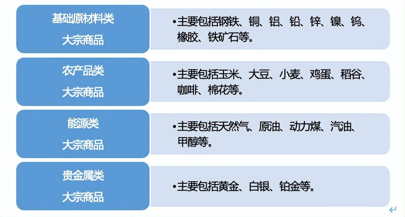 广义大宗商品是指具有实体、可进入流通领域,但并非在零售环节进行销售,具有商品属性并用于工农业生产与消费使用的大批量买卖的物资商品。其主要分为基础原材料、农产品、能源和贵金属四大类。在投资实践中,黄金等贵金属一般也会独立于其他商品单独分类,因为贵金属作为一种特殊的商品除具有基本的商品属性外,也具有金融属性。