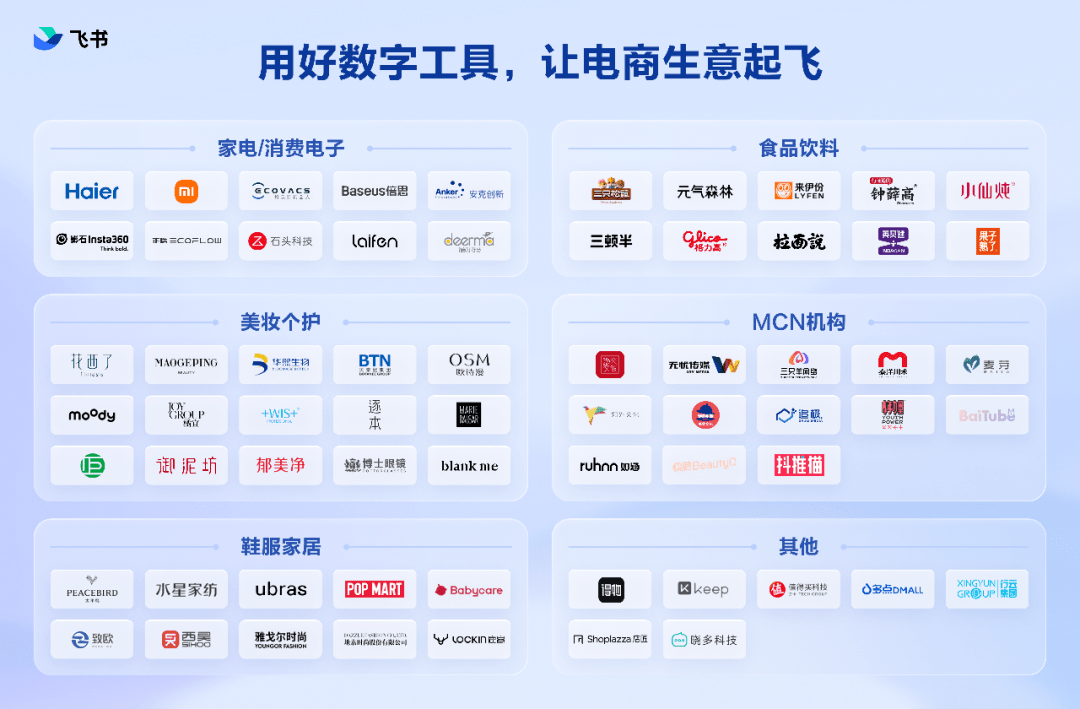 可以说,飞书逐渐成为消费品牌打通内外部渠道资源,提升运营管理能力,推动品牌线上渠道发展迭代的标配。