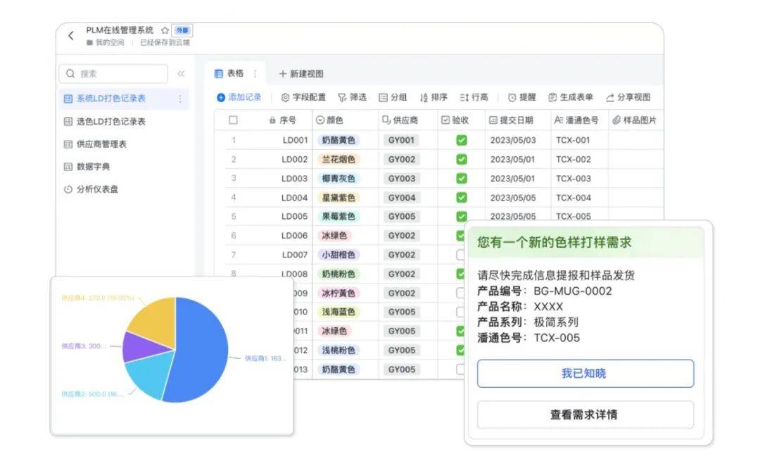 当然,贝泰妮不仅仅只是在用抖音做直播、销售,他们还充分挖掘了抖音的内容营销价值。而在这一过程中,飞书在幕后起到了十分关键的作用——帮助贝泰妮搭建了品牌营销内容的管理系统,即,用一张多维表格管理上百个品牌内容素材。相关员工只要打开飞书,不仅 1 分钟就能找到对应的素材,还能了解使用渠道、投放效果和相对应的产品。对于一些有使用期限的明星达人素材,飞书还能自动提醒合同到期时间,避免版权到期后的违约风险。