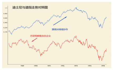 合伙企业散档后,奥马哈多了一群百万富翁,而巴菲特自己则将自有资金投入了巴郡,等待一个熊市。然而市场并未立即进入大熊市,1970年曾经下跌,但只是次级股票下跌,比如一本巴菲特传记中所记载:李腾工业集团跌70%,莱维特跌85%,四季护理中心跌64%……。市场继续炒作蓝筹股,所谓“漂亮五十”。比如麦当劳、IBM、迪士尼、宝洁、施乐、辉瑞等公司,各位一定耳熟能详。这些公司在1970年跌市中下跌30%至40%,但之后股价则持续翻倍。迪士尼自1970年低位至1973年初升4.3倍,麦当劳则劲升7倍!最高峰时迪士尼市盈率高达76倍。即使1973年至1974年大熊市,这些公司股价最低位都比巴菲特离场时更高。1974年巴菲特财富名义损失48.7%,但他认为此时正是入场好时机。