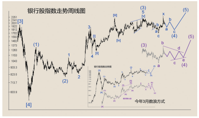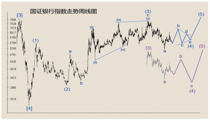 银行股指数去年10月底至今年5月上旬升浪为3浪结构,要么是间隔浪x,要么是b浪。基于基本面估值等因素,若是b浪则[5]浪(4)是一个水平三角形;若是x浪则[5]浪(4)是一个双重三。