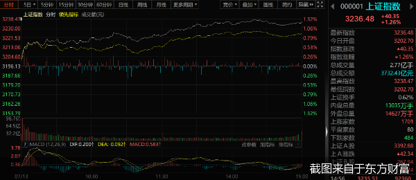 北京商报讯(记者 丁宁)7月13日,A股三大股指集体收涨,其中沪指收涨1.26%,重回3200点,深证成指收涨1.61%,创业板指收涨1.85%。