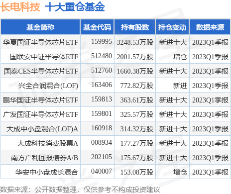 根据2023Q1季报公募基金重仓股数据,重仓该股的公募基金共94家,其中持有数量最多的公募基金为华夏国证半导体芯片ETF。华夏国证半导体芯片ETF目前规模为258.68亿元,最新净值1.0531(7月12日),较上一交易日下跌2.84%,近一年下跌11.98%。该公募基金现任基金经理为赵宗庭。赵宗庭在任的基金产品包括:华夏沪深300ETF联接A,管理时间为2017年4月17日至今,期间收益率为23.48%;华夏沪深300ETF,管理时间为2017年4月17日至今,期间收益率为23.77%;华夏野村日经225ETF,管理时间为2019年6月12日至今,期间收益率为24.35%;