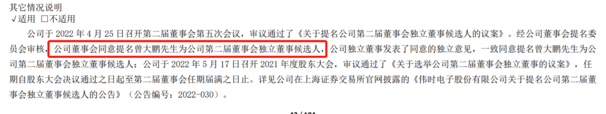 伟时电子2022年的年报也显示,曾大鹏为伟时电子的独立董事,除招股书披露的兼职外,还兼任上海威固的独立董事,任期为2023年2月至2026年2月。