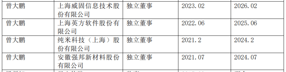 但据英方软件2022年披露的年报显示,除了强邦新材招股书披露的兼职外,曾大鹏还兼任伟时电子和上海威固信息技术股份有限公司(以下简称:上海威固)的独立董事,起任时间分别为2022年5月和2023年2月。