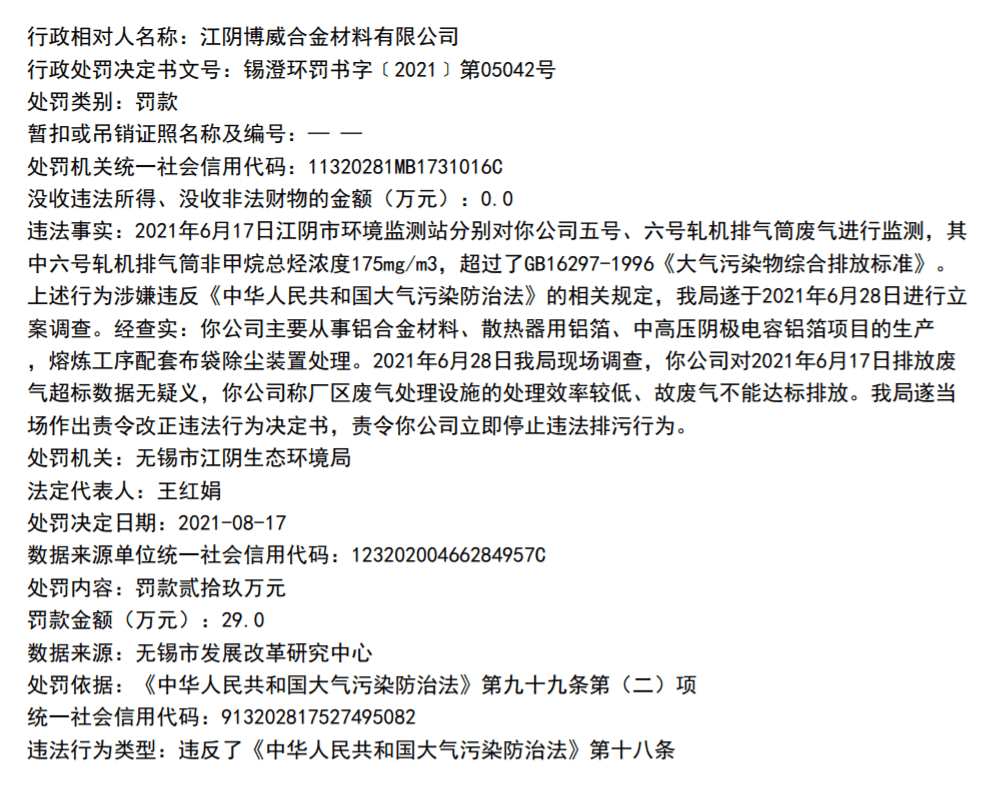 企查查显示,2020年博威合金在江阴市市场监督管理局对特种设备使用单位的监督检查中被发现问题并责令改正。此外,据锡澄环罚书字﹝2021﹞第05042号行政处罚决定书,因博威合金排放废气超标,2021年8月7日,无锡市江阴生态环境局对其处以罚款29万元的行政处罚。