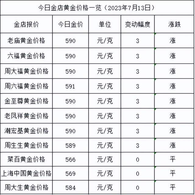 今天是7月13日,各大金店黄金价格又涨了,现在已经涨破590元/克,即将创新高,黄金价格又变高啦!目前,金价最高的金店为周六福,涨幅为3元/克,报价591元/克。而金价最低的金店也还是菜百,价格很稳定,依旧不变,报价566元/克。今日黄金价格高低差为25元/克,价差较大。