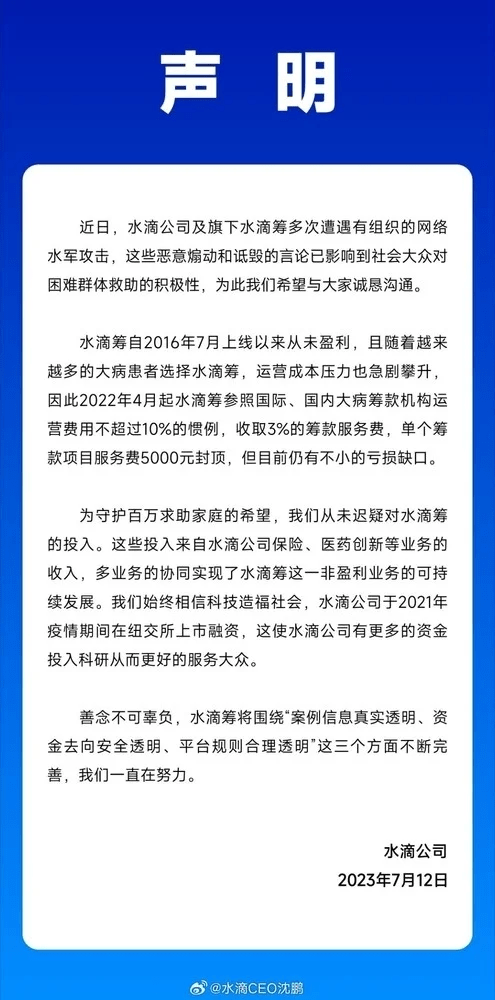 7月13日消息,水滴保、水滴筹创始人兼首席执行官沈鹏日前发文表示:近日,水滴公司及旗下@水滴筹 多次遭遇有组织的网络水军攻击,这些恶意煽动和诋毁的言论已影响到社会大众对困难群体救助的积极性。