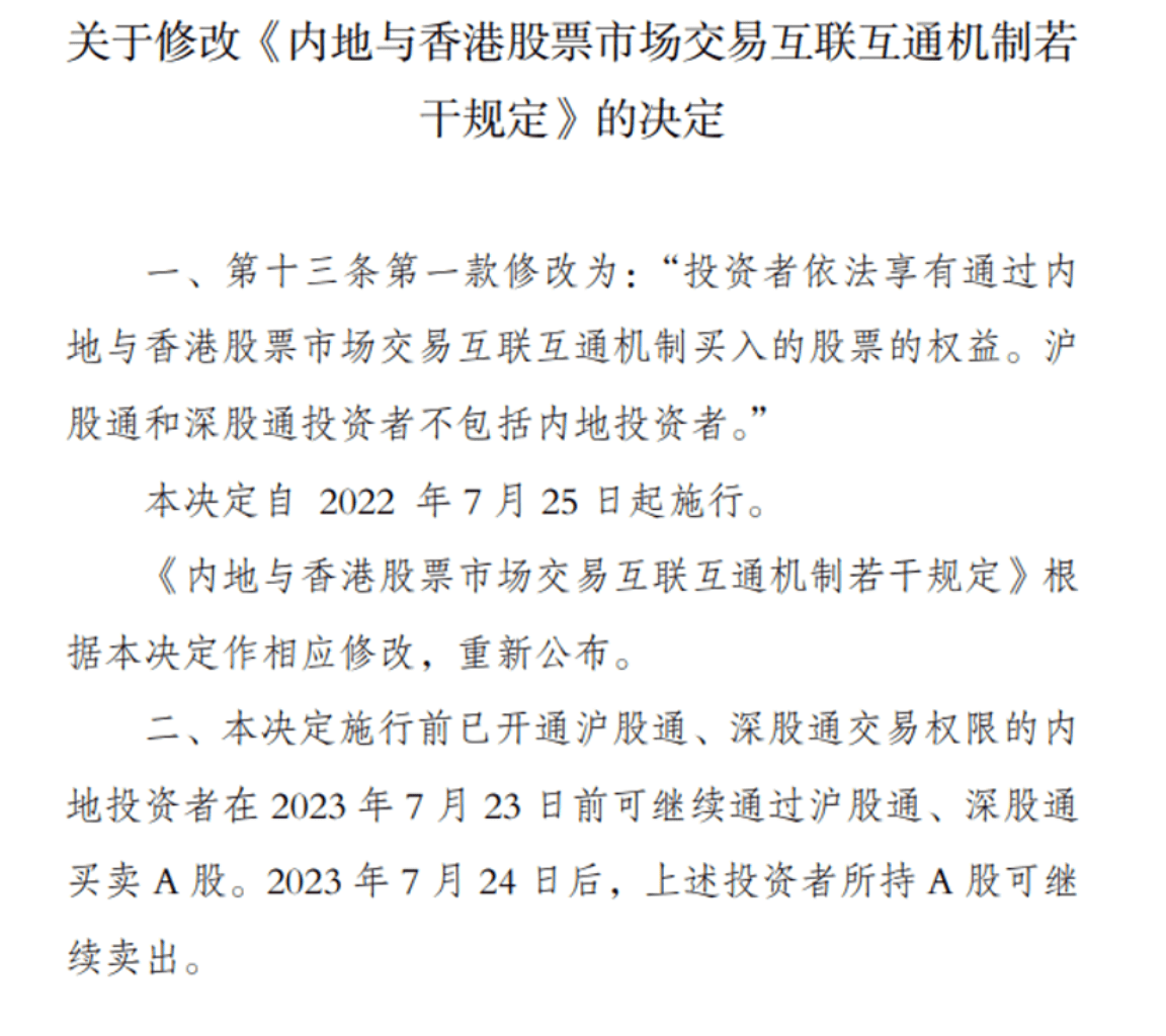 根据证监会官网,修改后的《内地与香港股票市场交易互联互通机制若干规定》已于2022年7月25日起施行,香港经纪商不得再为内地投资者新开通沪深股通交易权限,内地投资者也不得通过沪深股通买入A股,一年过渡期即将结束,这意味着上述规定生效在即。