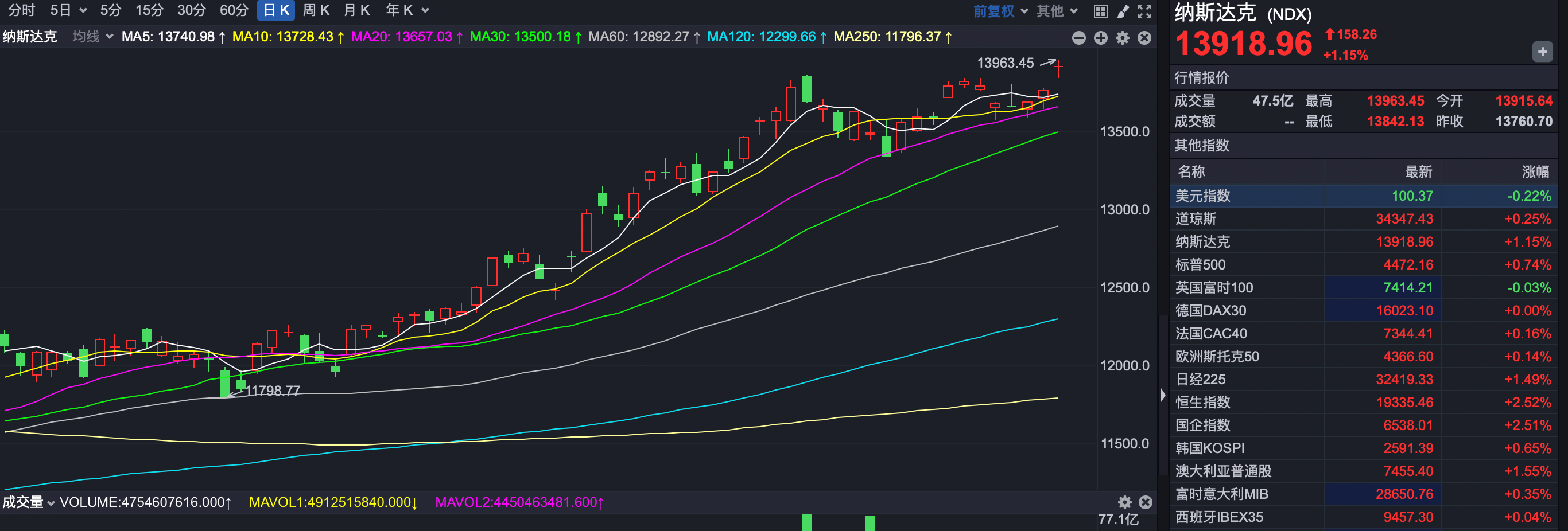 最终,纳指和标普500指数创2022年4月以来新高。截至收盘,道指涨幅0.25%,报34347.43点,纳指涨1.15%;标普500指数涨0.74%。