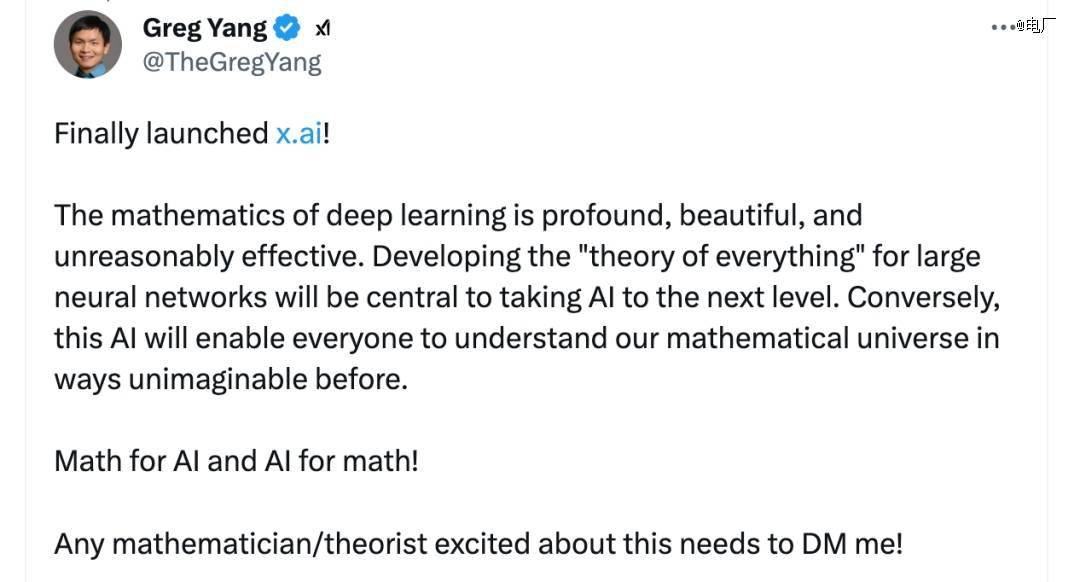 另一位 xAI 联合创始人、曾就职于微软研究院的 Grey Yang 在 Twitter 上发布的招聘启事中,还表示 xAI 将致力于「利用深度学习开发大型神经网络,使用这种 AI 使每个人都能以前所未有的方式理解数学」,招募的人才方向其中也包括数学家。