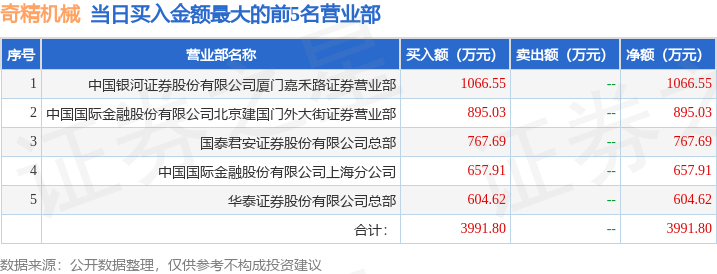 沪深交易所2023年7月13日公布的交易公开信息显示,奇精机械(603677)因有价格涨跌幅限制的日价格振幅达到15%的前五只证券,有价格涨跌幅限制的日收盘价格涨幅偏离值达到7%的前五只证券登上龙虎榜。此次是近5个交易日内第2次上榜。