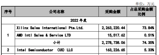 以科通技术第一大供应商Xilinx(下称“赛灵思”)为例。按照含返利的目录采购价格口径,科通技术报告期内向赛灵思的采购金额分别为94.77亿元、211.92亿元、226.32亿元,采购金额占比分别为71.99%、74.12%和73.84%。