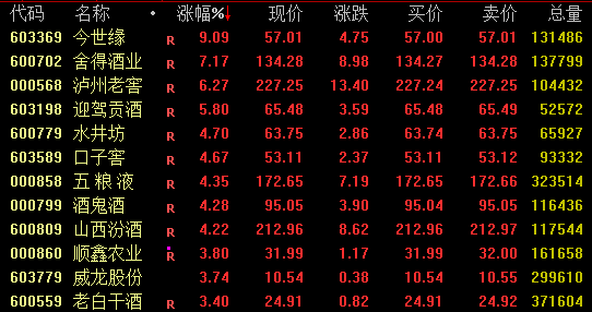 近期整体疲弱的白酒股今日强势反弹,截至收盘,今世缘涨逾9%,盘中一度触及涨停;舍得酒业涨超7%,泸州老窖、迎驾贡酒涨约6%,水井坊、五粮液、酒鬼酒、山西汾酒等涨逾4%,贵州茅台亦拉升。