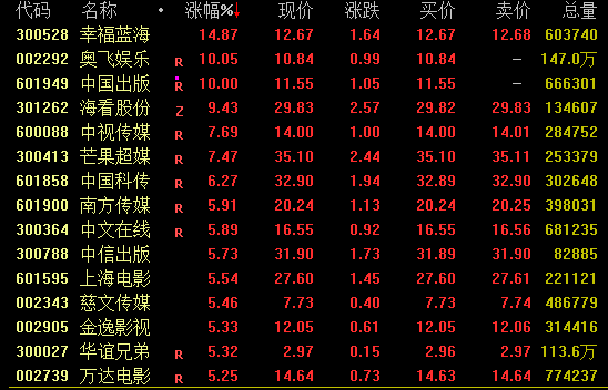 传媒板块盘中走势活跃,影视股表现亮眼,截至收盘,幸福蓝海大涨近15%,奥飞娱乐涨停,芒果超媒涨超7%,上海电影、慈文传媒、华谊兄弟、万达电影等涨超5%。