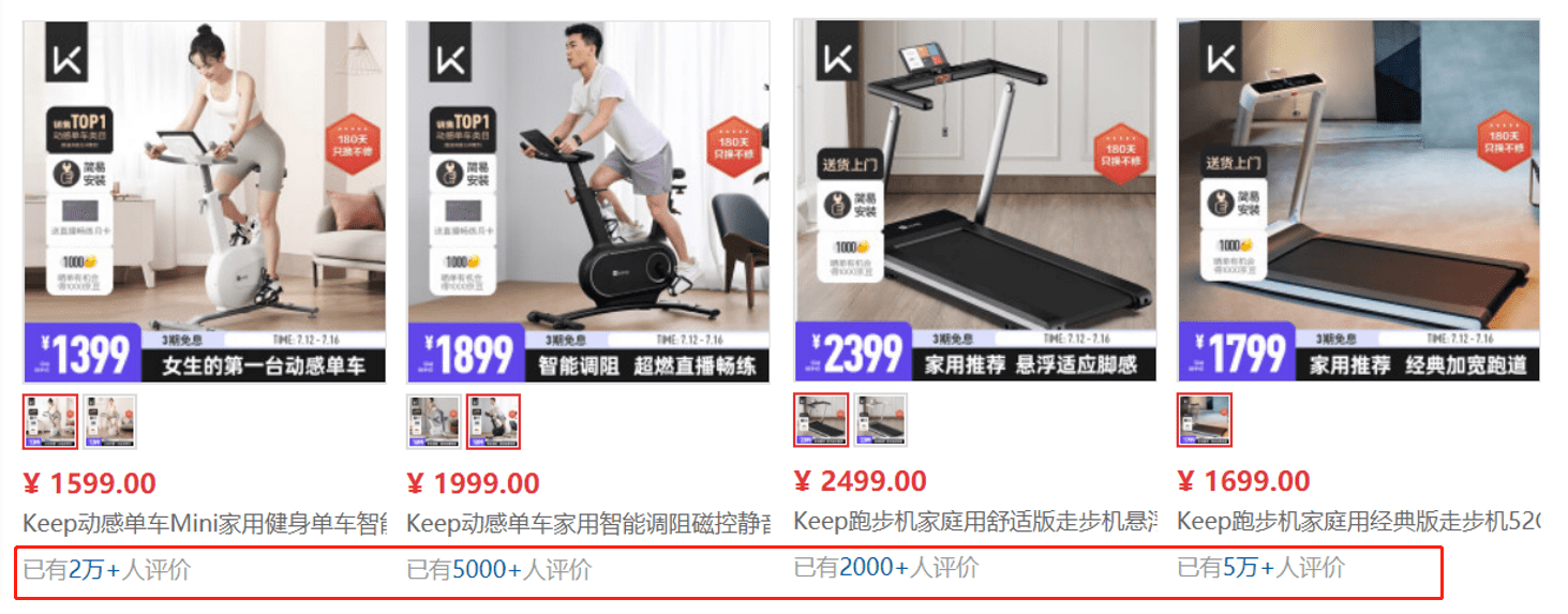 翻看京东、天猫等多个电商平台,动感单车、跑步机都是Keep最畅销的智能运动硬件产品。在京东官方旗舰店上,Keep mini家用动感单车CC、Keep家用智能动感单车CLR和Keep经典款智能跑步机K1销量、好评率都是遥遥领先。尤其是作为初代爆款的K1智能跑步机,累计评价人数已经超过5万。