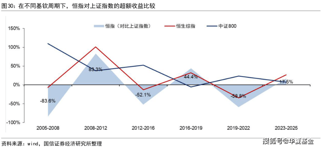 据国信证券统计,相较于A股,港股有一个“循环往复”的规律。即在港股估值较低的时期,港股在下一个库存周期往往跑赢A股。包括2008-2012年、2016-2019年,以及预期的2023-2025年。
