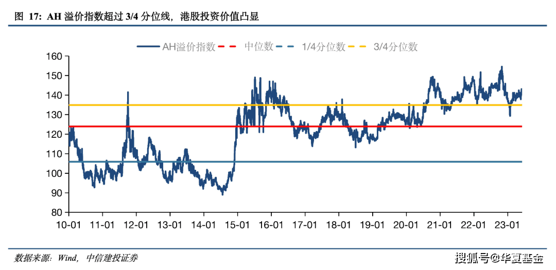 相对估值的层面看,当前AH溢价指数远超100的分位线,港股相对估值更低,投资价值凸显。