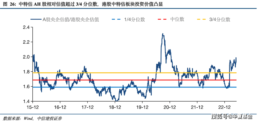 在前期的“中特估”行情中,港股央国企的涨幅远不及A股,推升AH溢价攀至历史高位,在未来“中特估”的行情演绎中,港股央国企补涨空间或更大,提示重点关注。