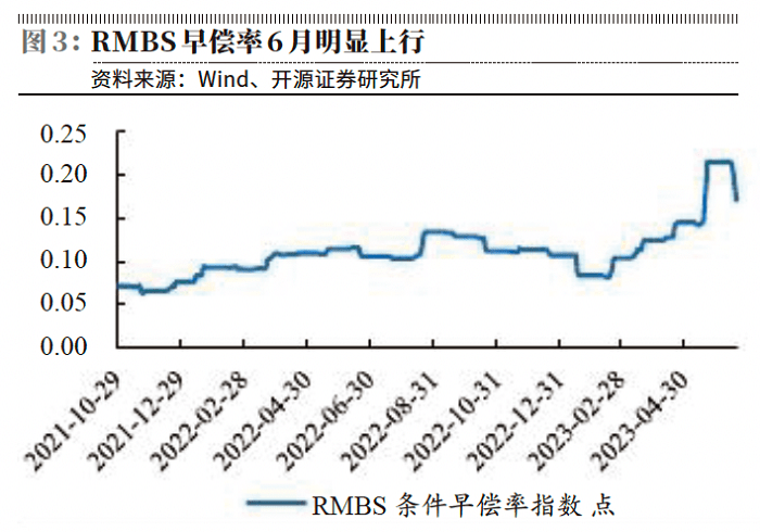 从负债端来看,实体经济需求处于慢复苏阶段,高收益的优质资产仍然不多,居民用闲置资金提前还贷,被看作资产配置的理性选择。2023年6月初,RMBS条件早偿率指数继续上升至有统计以来最高,加之5月新增居民中长期贷款未见明显多增。由于当前居民降杠杆意愿仍较为强烈,提前还贷对于银行净利息收入的拖累或未完全释放。