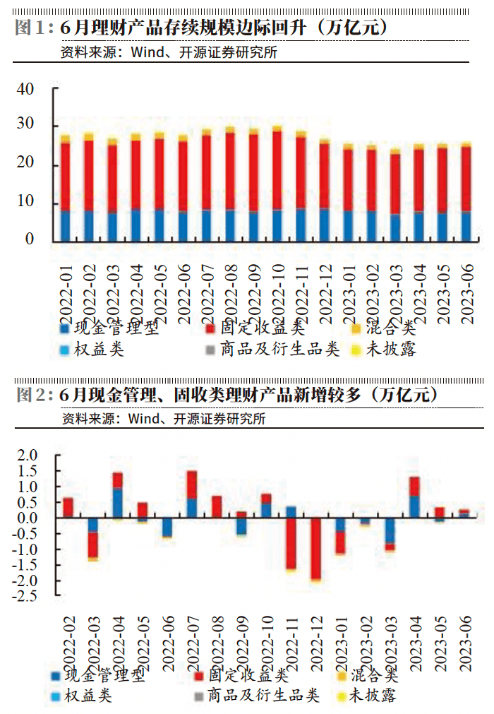存款利率下降引发“存款搬家”,低风险理财是一大去向。理财资金与银行存款存在“跷跷板”效应。历年6月是银行存款考核大月,通常低风险理财规模当月为负增长。但2023年6月现金管理类、固收类产品分别正增长0.12万亿元、0.13万亿元,这可能与6月初新一轮存款利率调降的影响有关。