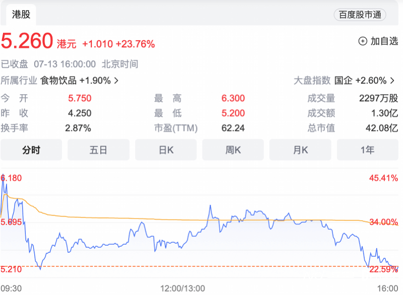 7月13日,头顶着“周杰伦”光环的巨星传奇(06683.HK)正式登陆港交所,开盘即大涨,盘中一度冲高到45.41%,午后股价开始回落,截至当日收盘,报5.26港元,涨幅为23.765%,市值为42.08亿港元。
