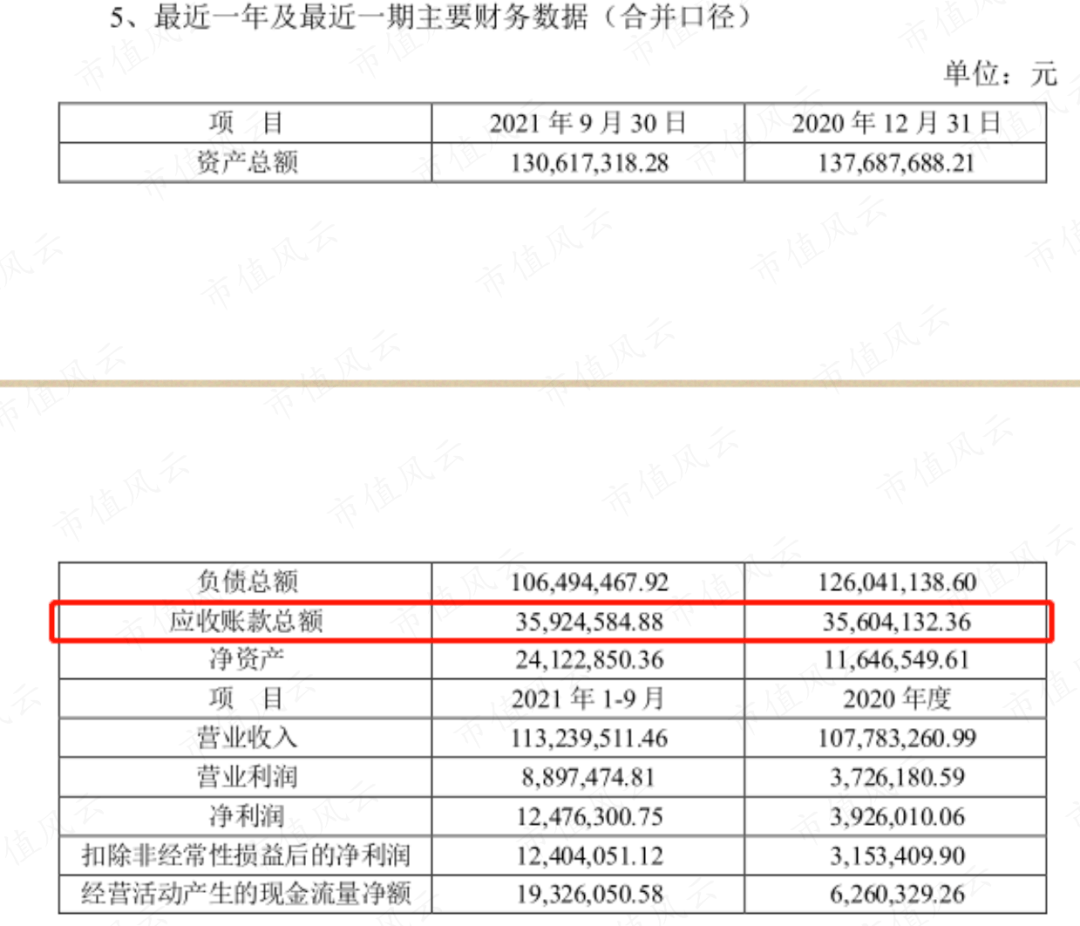 截止2021年三季度末,瑞点精密营业收入1.13亿元,净利润1248万元;应收账款为3592万元,占总资产的27%。