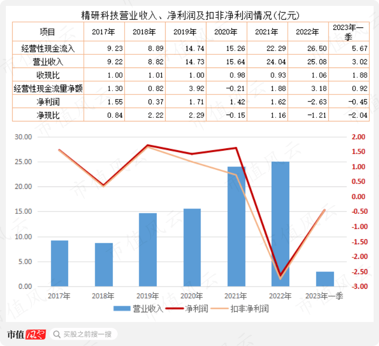 2023年5月30日,精研科技发布公告称,安特信在2022年扣非净利润-6676万元,与3600万元的业绩承诺相差10276万元。2020至2022年三年累计业绩承诺为7200万元,而实际是三年扣非净利润累计亏损1.12亿元,安特信没有一个月是完成分摊下的业绩承诺的。