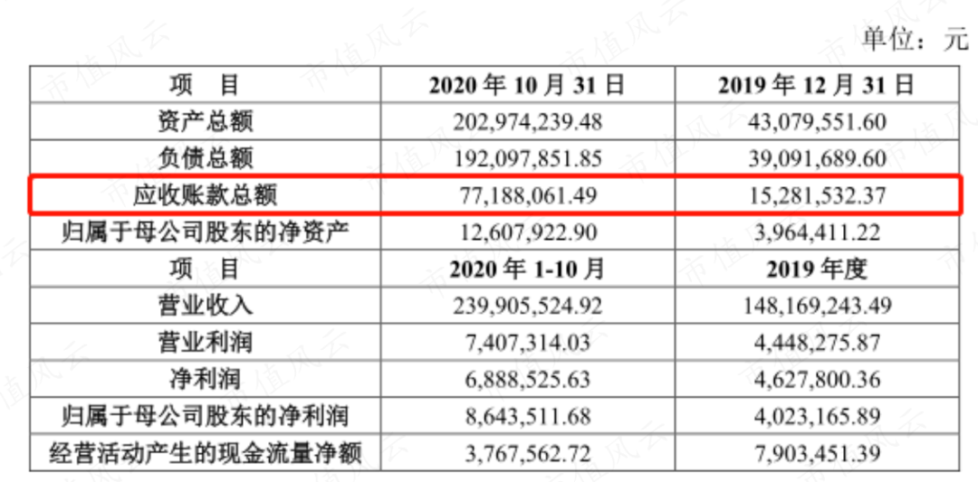 此外,该公司总资产主要组成部分是应收账款,7719万元的应收账款约占到2.03亿元总资产的40%。