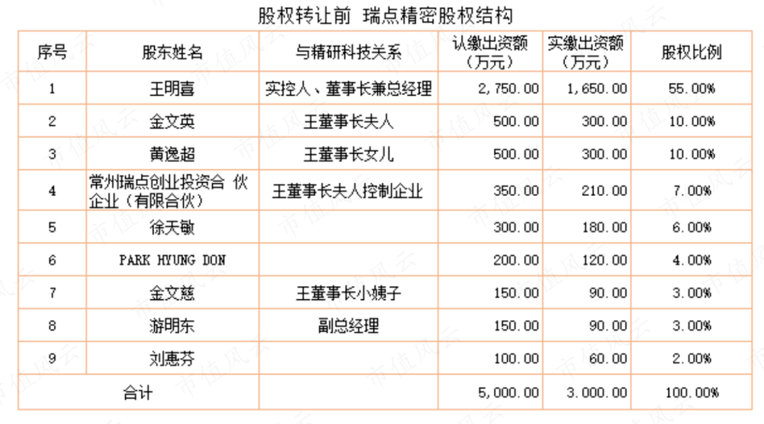 精研科技的实控人、董事长兼总经理王明喜,董事、董事会秘书黄逸超两人为父女关系,均持有瑞点精密股权。